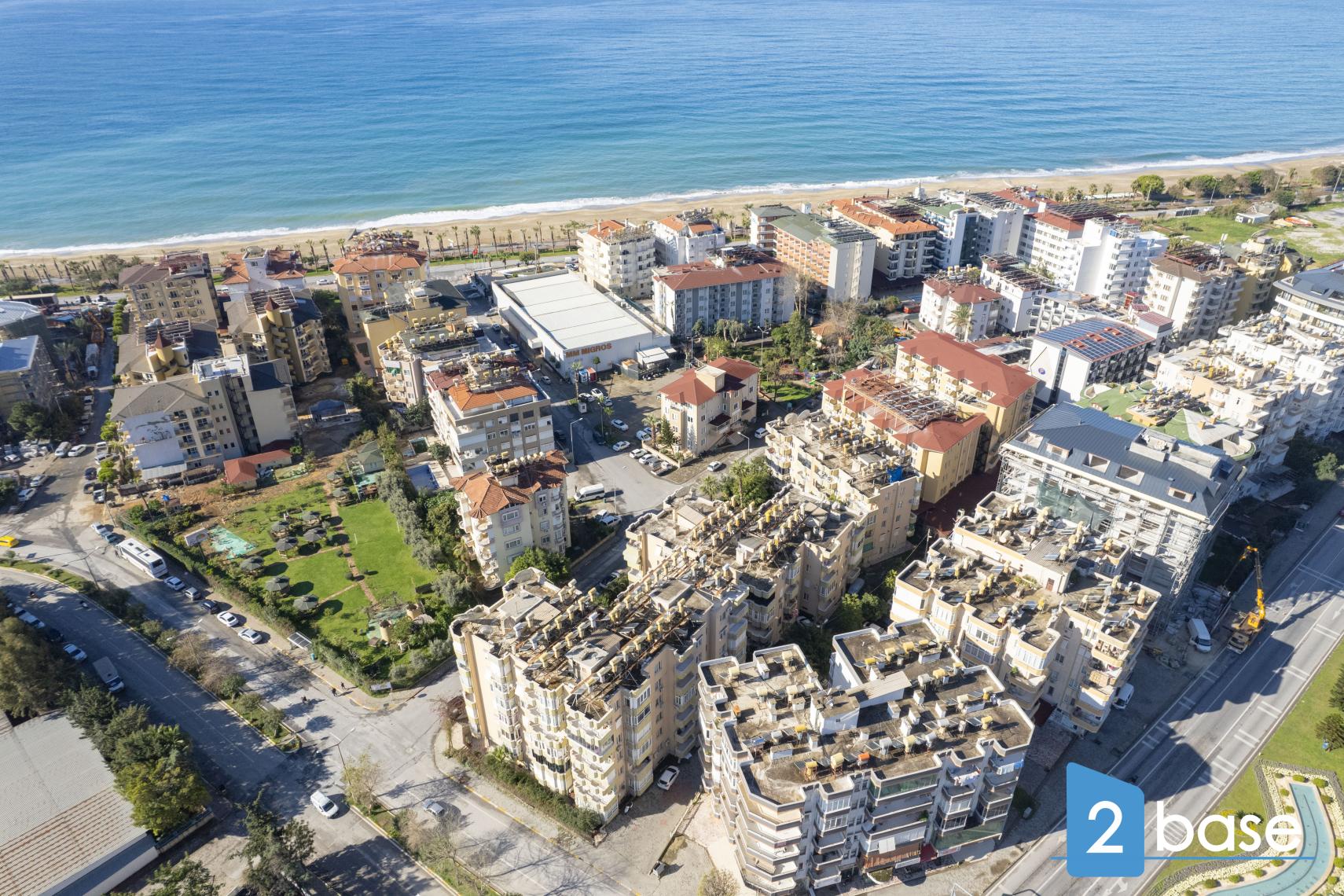 Каля пляжу Клеапатра. Прама ў цэнтры горада, побач з крамамі і рэстаранамі..