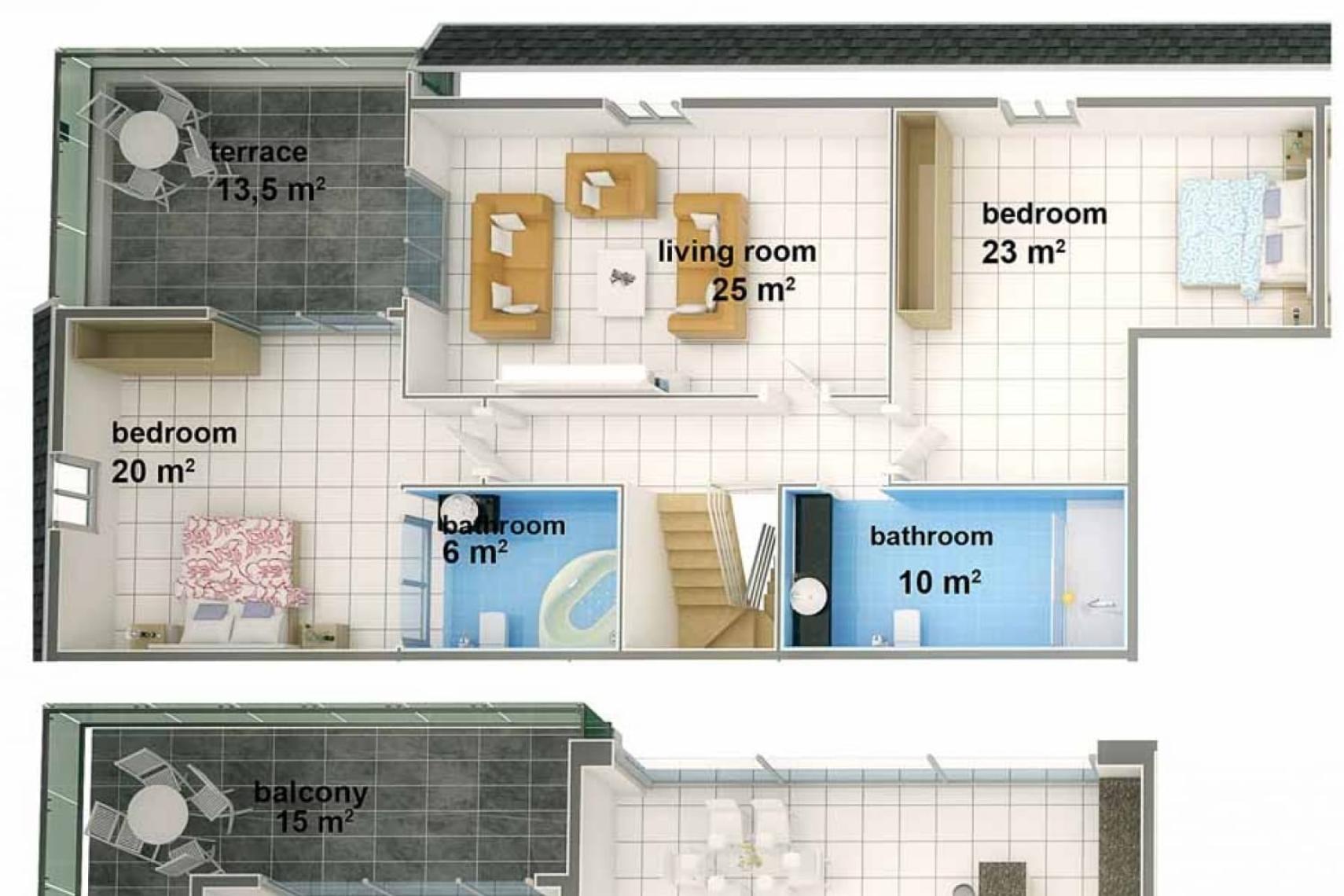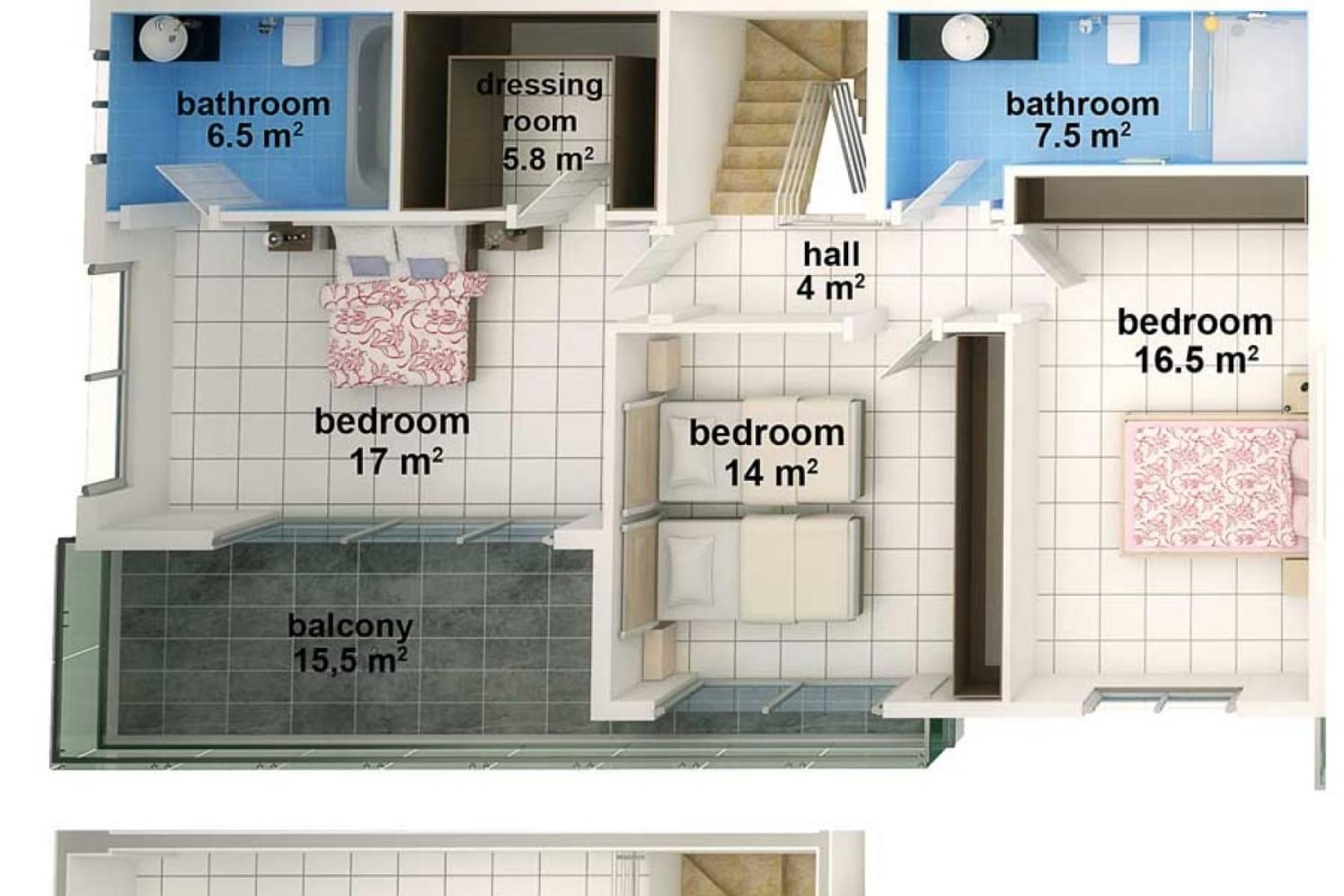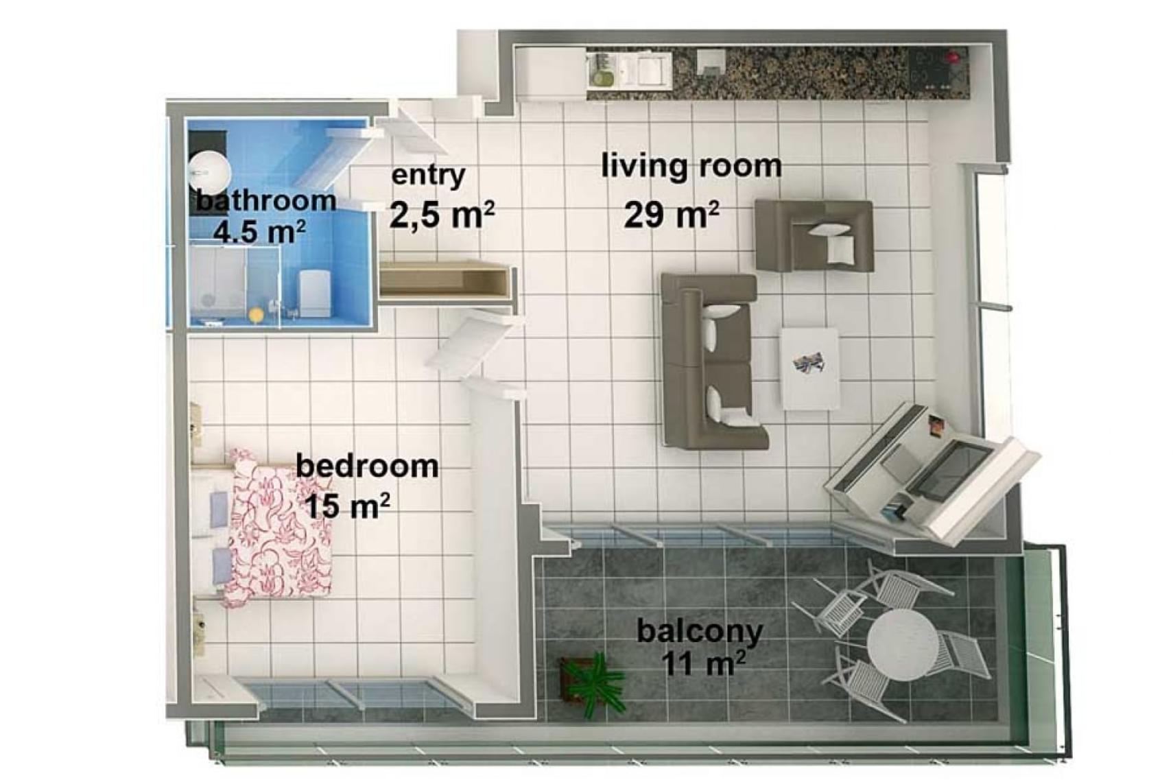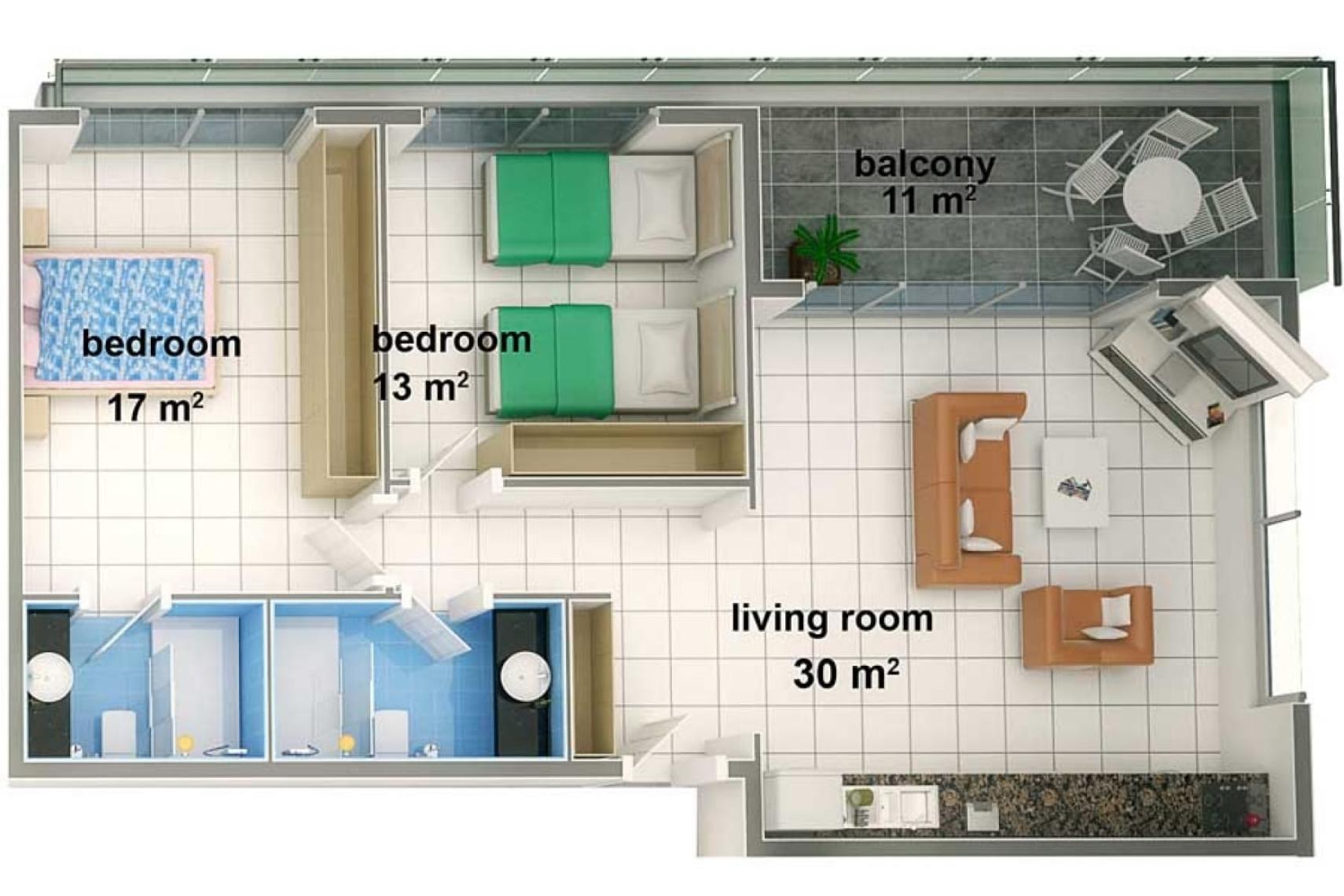Aircondition til opvarmning og nedkøling til både stue og soveværelser. Amerikansk køkken med ovn, komfur, køleskab og opvaskemaskine. Stort badeværelse med flotte lyse klinker. Feriebolig med indbydende balkoner til de varme sommeraftener.