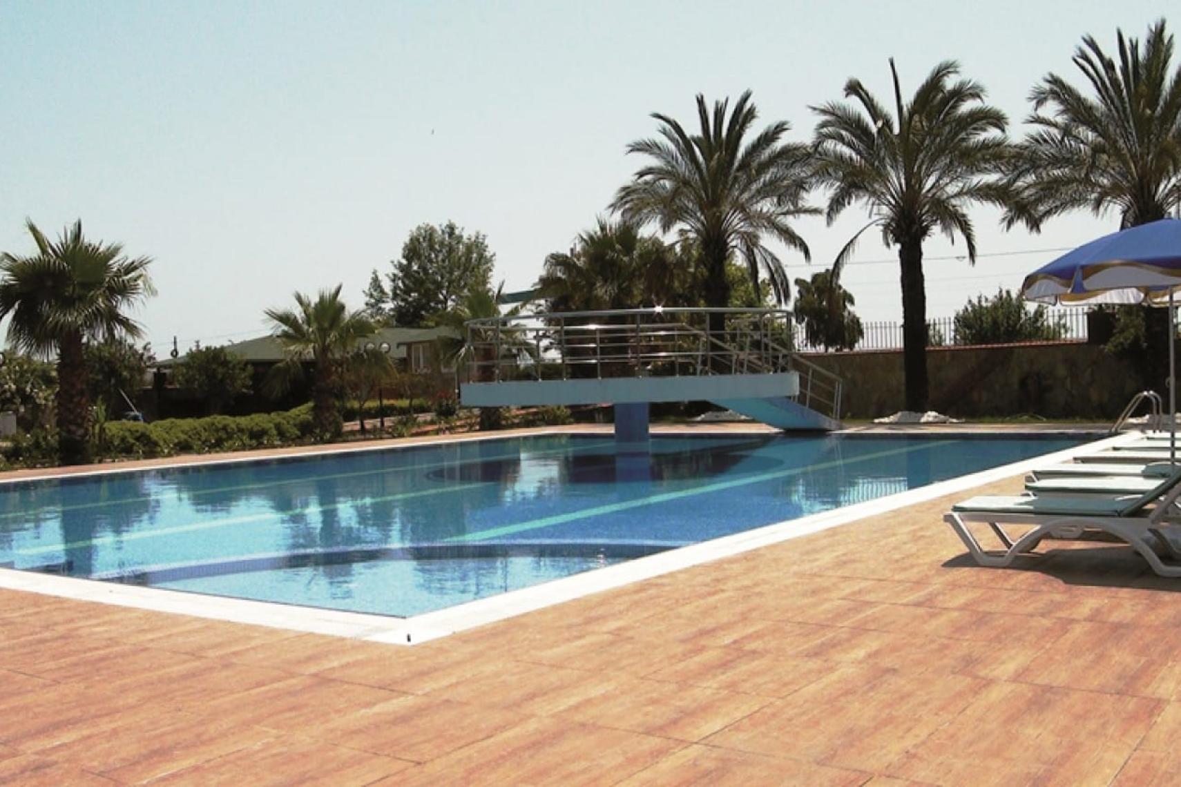 The central outdoor area features a main swimming pool with a diving board, a separate children’s pool, and a