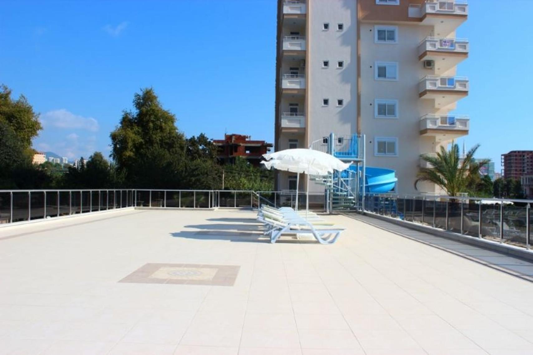 Atlas I Mahmutlar is a 5533 sqm residential complex in Alanya featuring three modern buildings, landscaped gardens, swimming pools with waterslides, and a private tennis court. Located ten minutes on foot from the beach and city center, with shops and restaurants nearby.