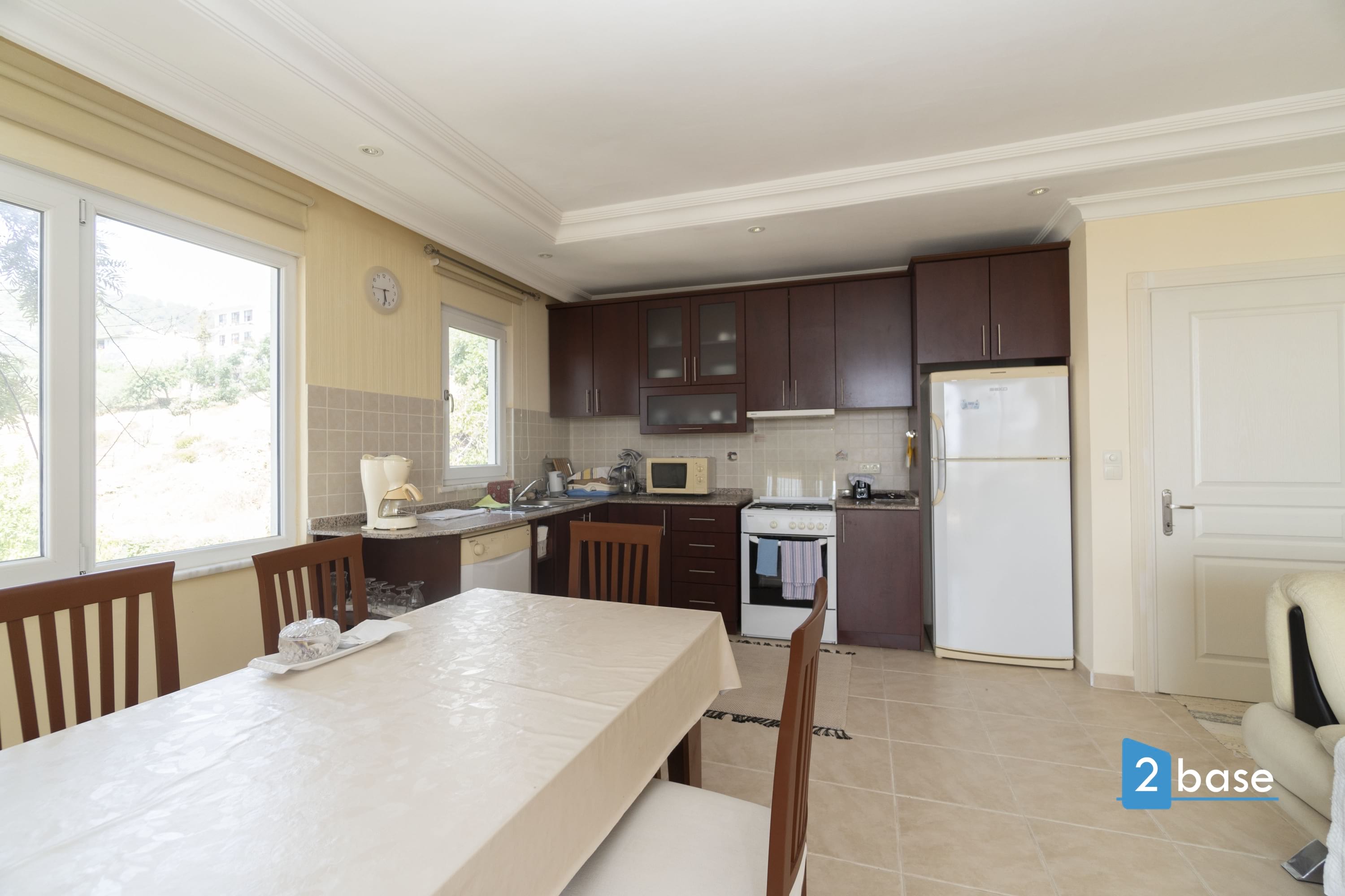 Furnished balcony with table and chairs. Air conditioning for heating or cooling both living room and bedrooms. A Peaceful holiday home furnished and ready for occupation. American kitchen with oven, hob and refrigerator.