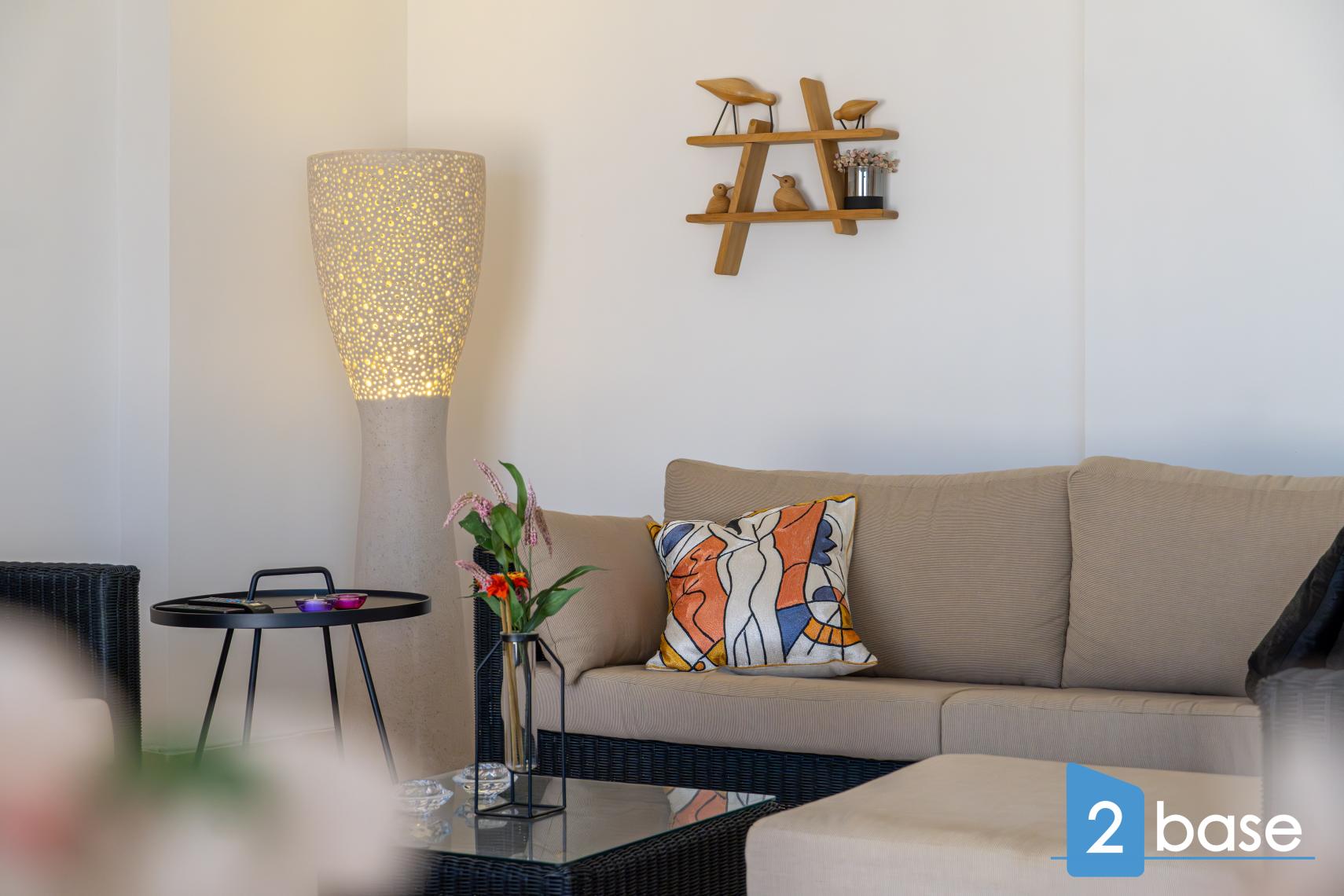 Una casa de vacaciones tranquila, amueblada y lista para ocupar.. Aire acondicionado para calefacción o refrigeración tanto del salón como de los dormitorios.. Cocina americana con horno, placa de cocina, refrigerador y lavavajillas.. Casa de vacaciones con balcones acogedores para las cálidas noches de verano..