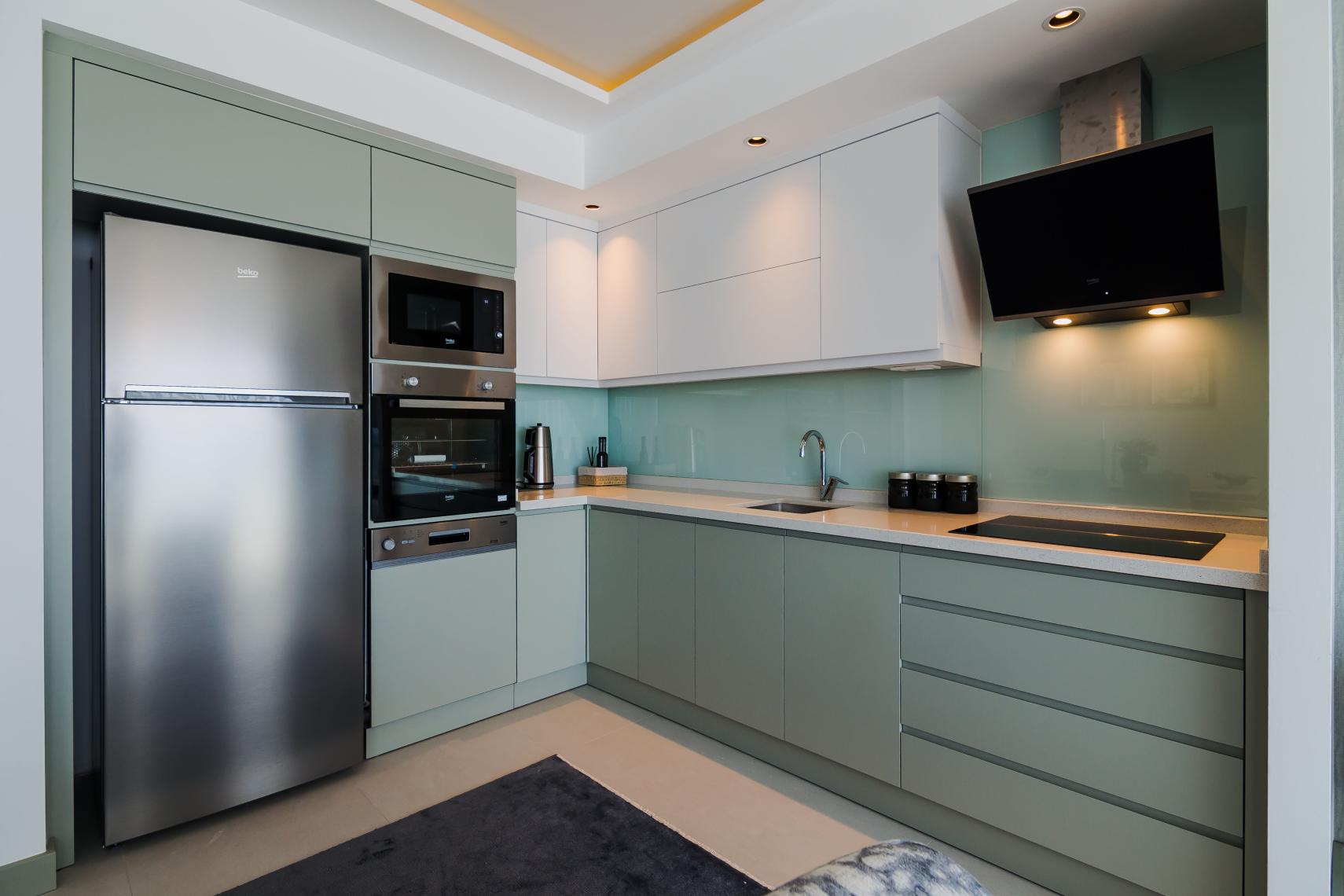 დიდი და ღია სამზარეულო სკანდინავიური ხარისხით. მშვენიერი, ფართო და მიმზიდველი აბაზანა. ამერიკული სამზარეულო ღუმელით, ქურით, მაცივრით და ჭურჭლის სარეცხი მანქანით.. ელექტრო წყლის გამაცხელებელი სისტემა.