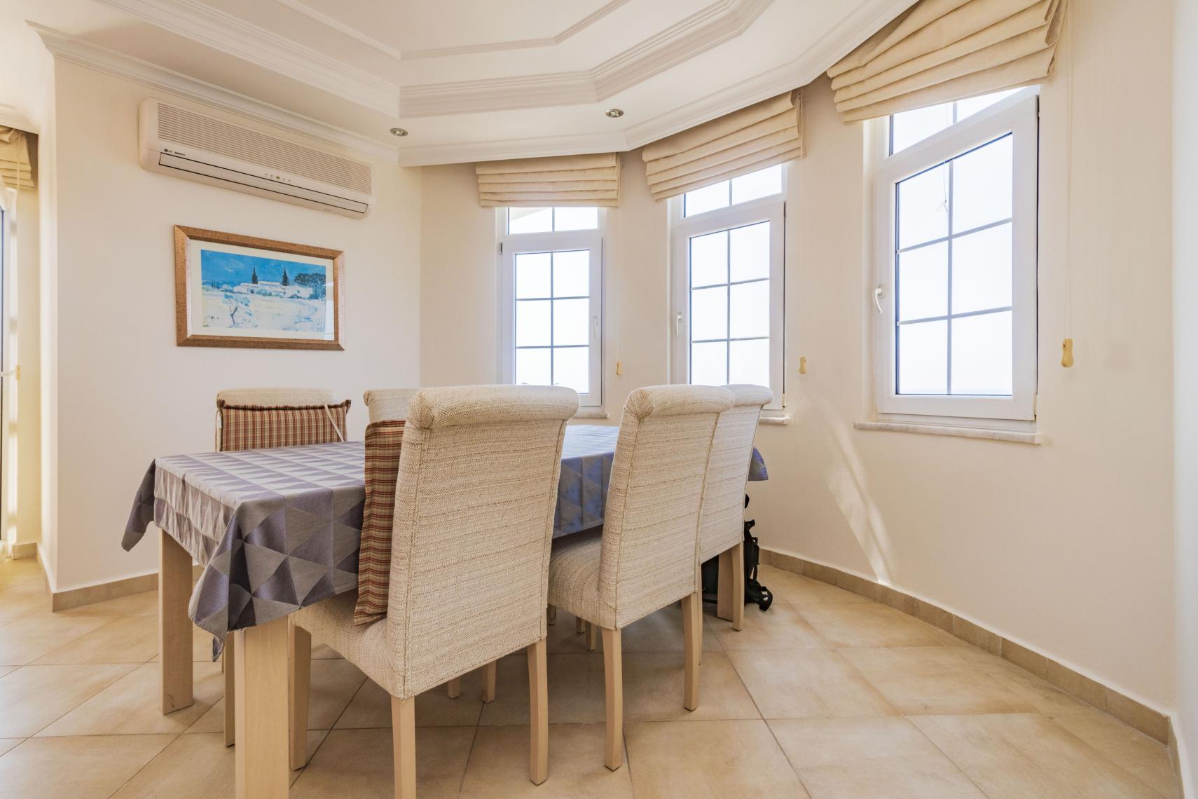 Légkondicionálás a nappali és a hálószobák fűtésére és hűtésére is.. Egy békés nyaraló berendezve és azonnal beköltözhető állapotban.. Amerikai konyha sütővel, főzőlappal, hűtőszekrénnyel és mosogatógéppel.. Bútorozott erkély asztallal és székekkel..