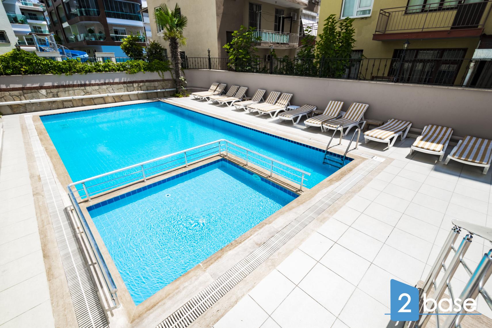 Útirýmið innifalið langstælt sundlaug með sólstólum og sérstaka grunna barnalaug. Við hliðina á lauginni er skuggað leiksvæði með litríkum búnaði, staðsett nálægt slappisvæði og borðstofu í útistöðum. Palmtré og göngustigar tengja sundlaugarsvæðið við aðalinnnganginn og íbúðirnar.