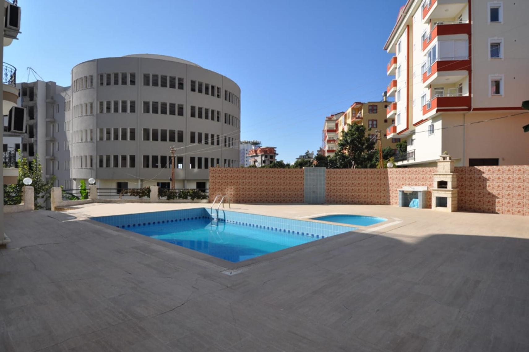 Kompleks, yüzme havuzu ve ayrı bir çocuk havuzu ile çevrelenmiş, olgun bitki