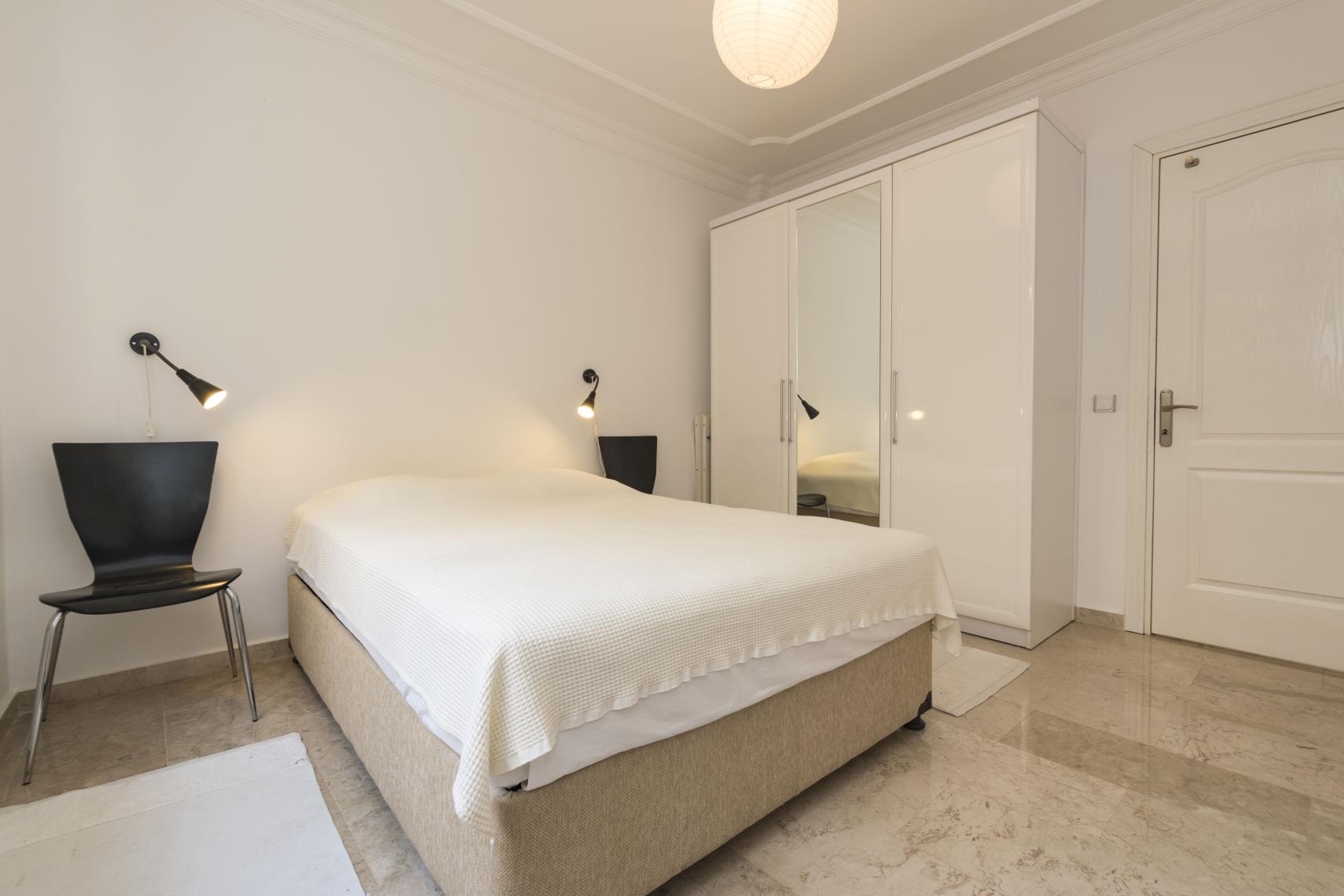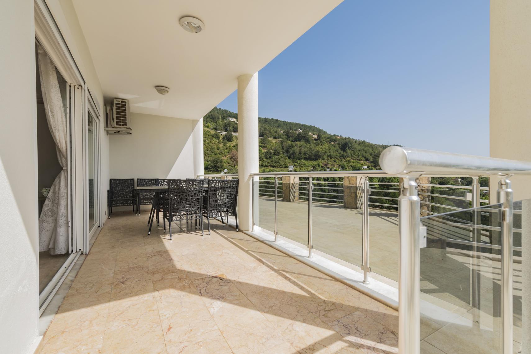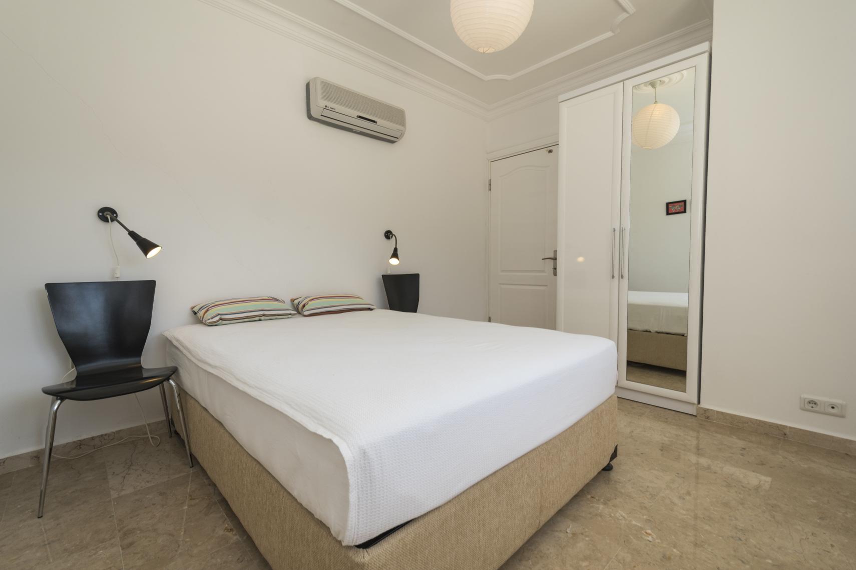 Oturma odasında ve yatak odalarında klima. Huzur verici ve rahatlatıcı mobilyalı bir daire, hemen taşınılabilinir. Büyük ve hoş bir banyo. Balkonunda masa sandalye kurulu.
