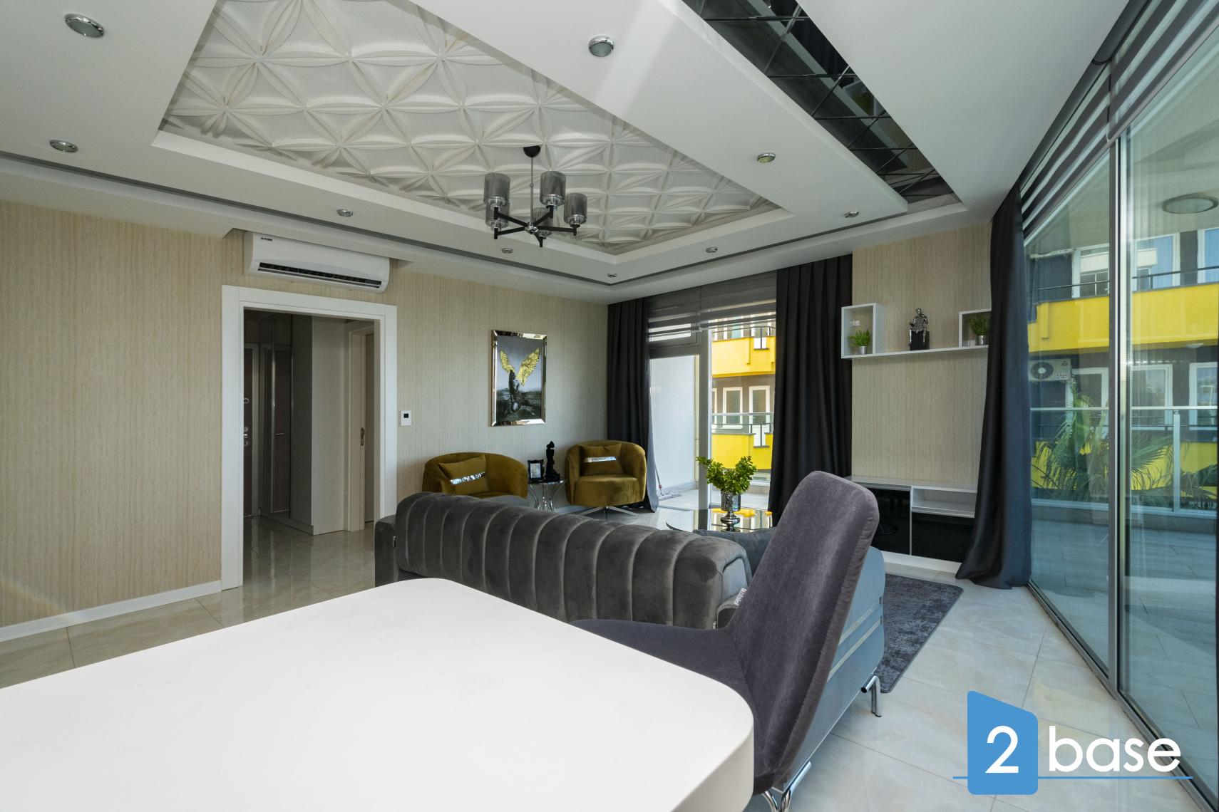 Oturma odasında ve yatak odalarında klima. Avrupa tarzı mobilyalarla döşenmiş lüks bir daire. Amerikan mutfaklı ve bar masalı. Büyük ve hoş bir banyo.