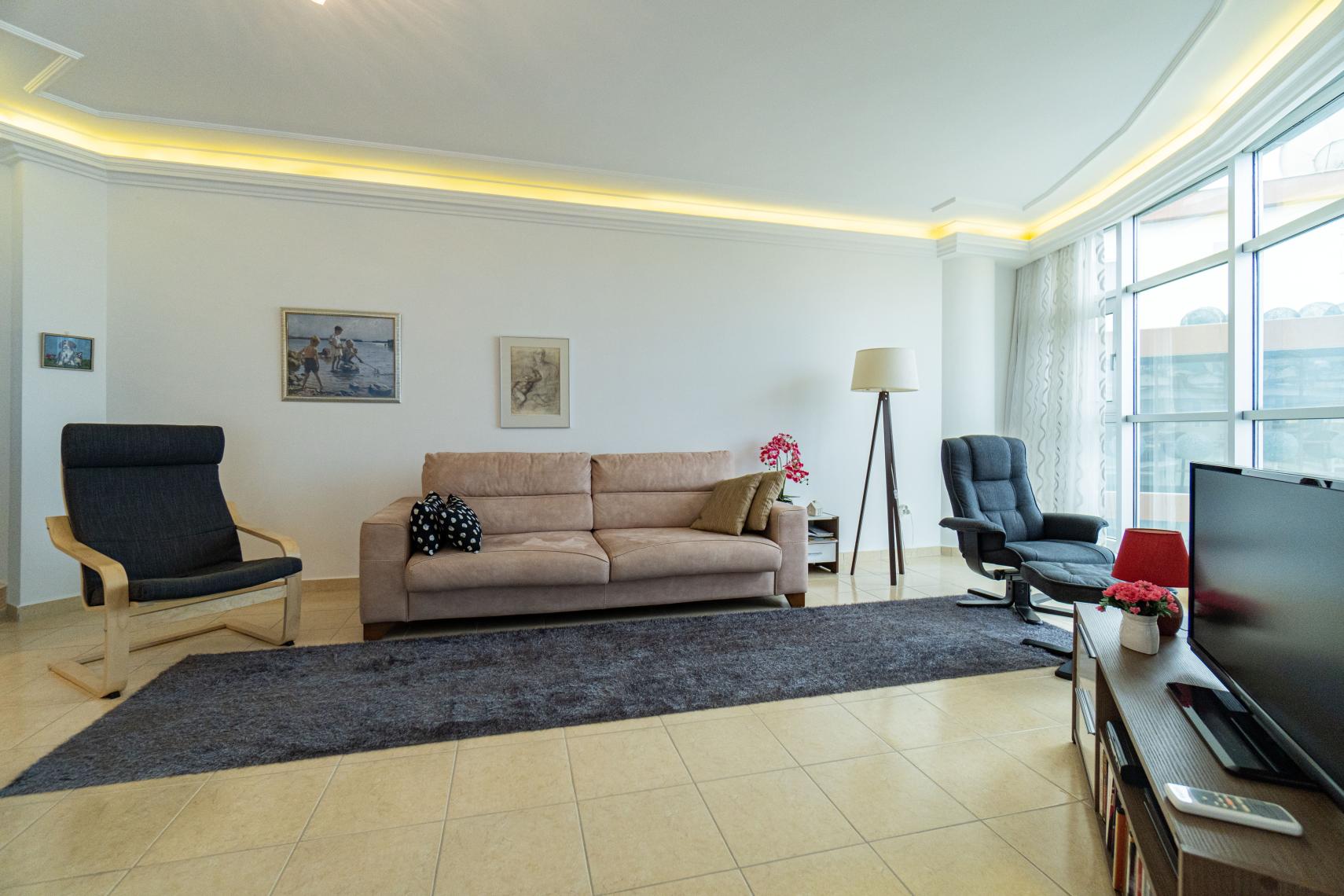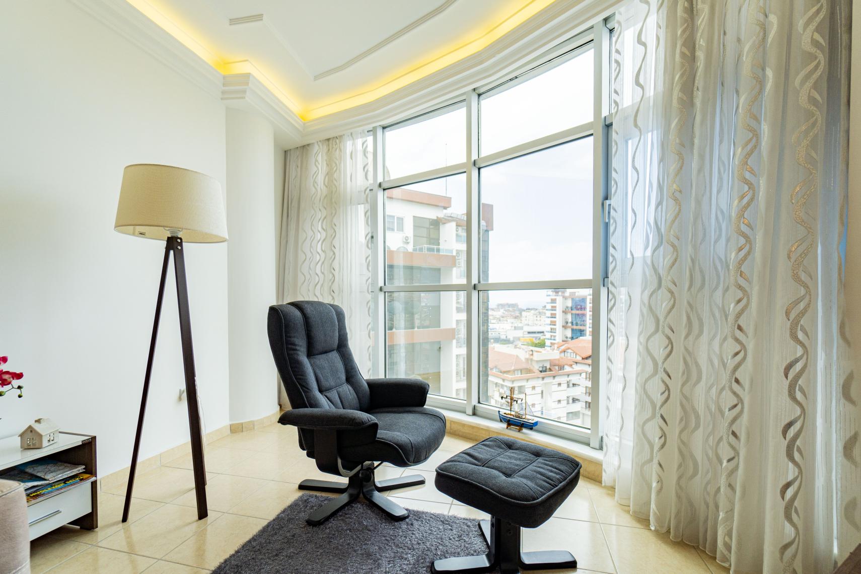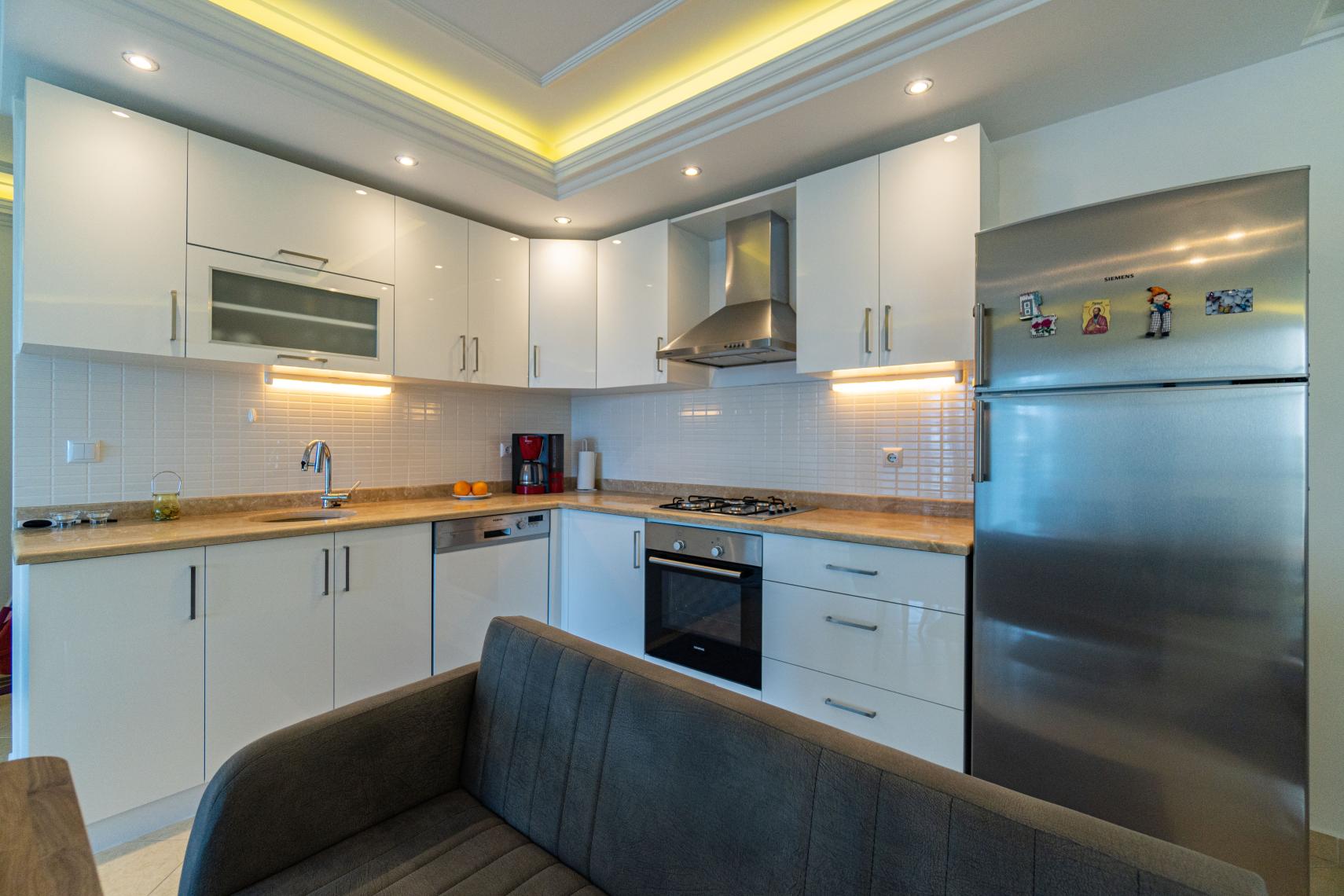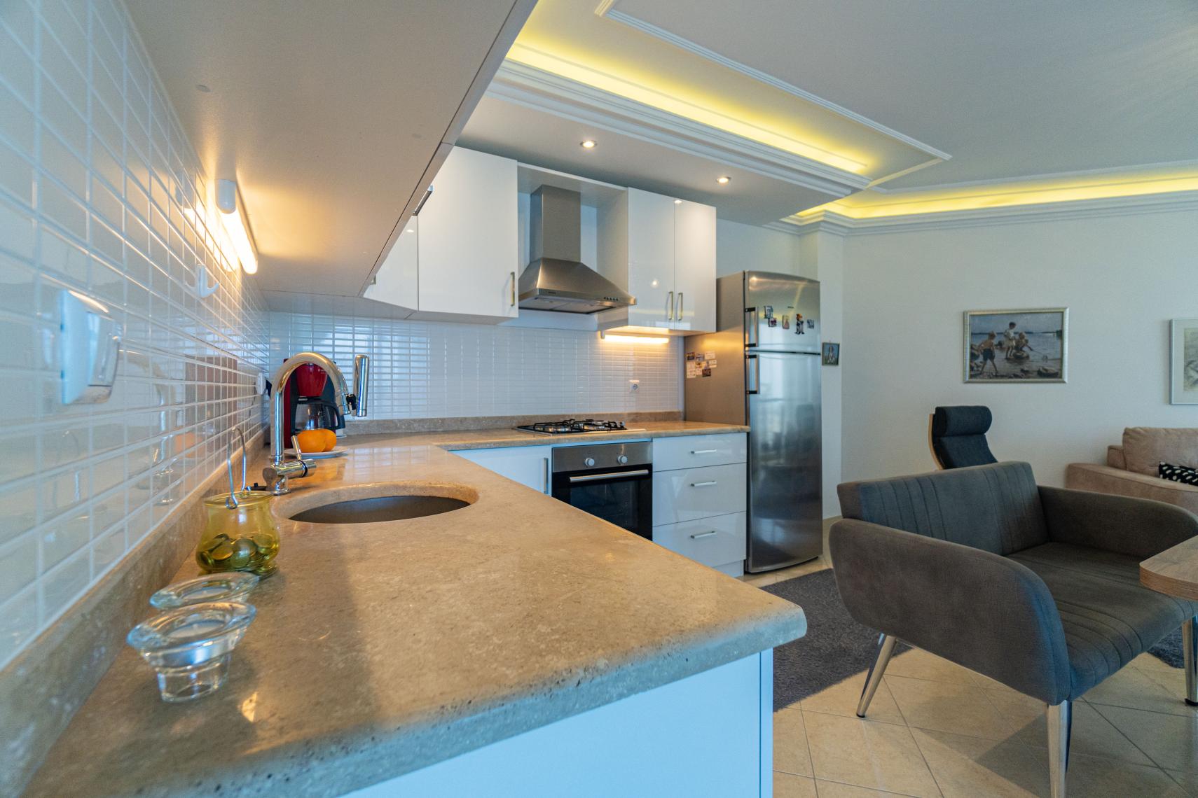 Кондиціонер для обігріву або охолодження як вітальні, так і спалень. Ванна у ванній кімнаті. Американська кухня з духовкою, плитою і холодильником. İдеально підходить для середземноморських вечорів з великими балконами.